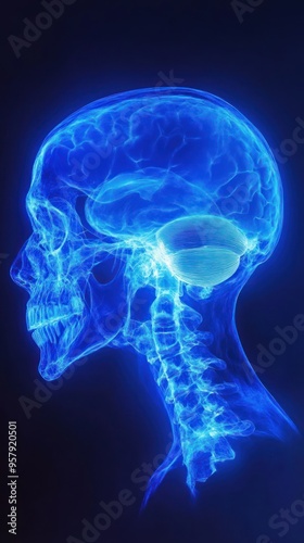 A 3D rendering of a human skull with a blue glowing brain and spinal cord.
