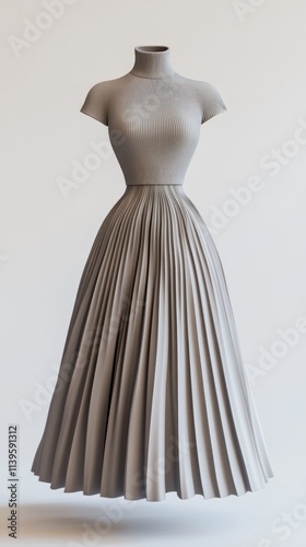 A 3D rendering of an elegant pleated skirt and high-neck dress, displaying soft textures and fine pleats, highlighted by professional high-quality photography against a minimalist white background.