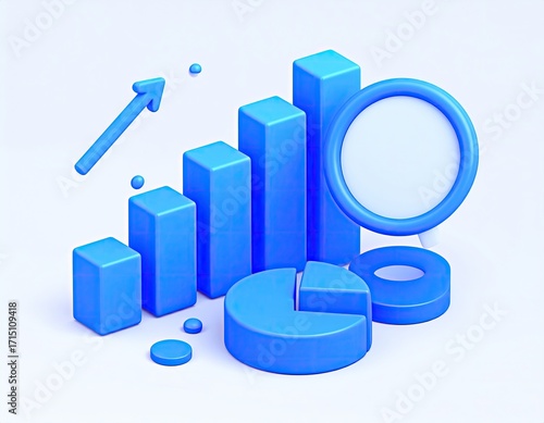 A 3D rendering of blue bar graph, pie chart, magnifying glass, and upward arrow on a light background, suggesting growth and analysis