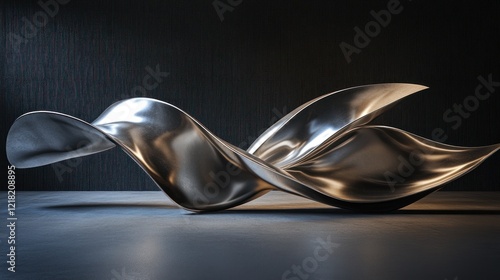 A 3D rendering of sharp-edged abstract metal curves with a gunmetal finish, highlighted by dramatic contrast lighting