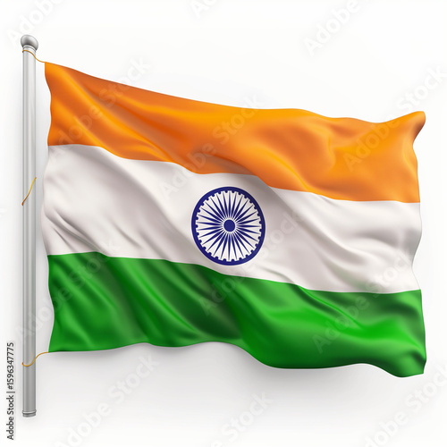 A 3D rendering of the vibrant Indian flag waving on a flagpole, set against a clean white background