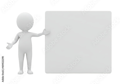 A 3d white figure stands next to a blank white board, isolated on transparent background