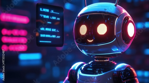 A 3D-rendered chat robot holding a conversation with a user, with futuristic graphics and text bubbles