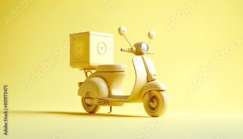 A 3D-rendered image of a charming, yellow scooter. The scooter has a sleek design with rounded edges and is equipped with a delivery box