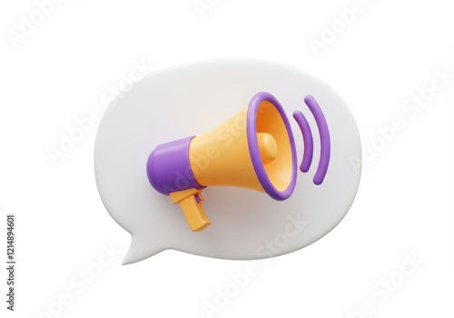 A 3D-rendered purple and yellow megaphone positioned inside a rounded white speech bubble isolated on white background