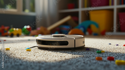 A 3D-rendered robot vacuum navigates a carpet scattered with toys, using boundary detection to avoid obstacles