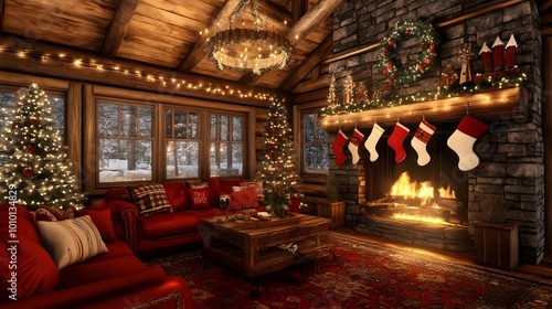 A 3D-rendered rustic cabin decorated with Christmas lights and stockings, radiating warmth and charm for a cozy holiday setting