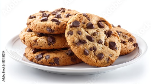 A 4K photo of freshly baked chocolate chip cookies stacked on a plate isolated on white background.