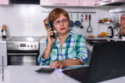 A 65-year-old woman works at home online by laptop and talks via phone because of the corona virus pandemic, more companies in are relying on the home office for their employees.