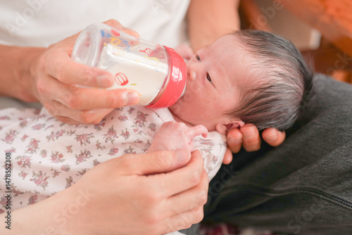 A 7-day-old baby drinks milk from a bottle while lying on the lap of a Japanese dad in his 20s. This tender moment shows quiet love and the start of fatherhood. Great for parenting or family content.