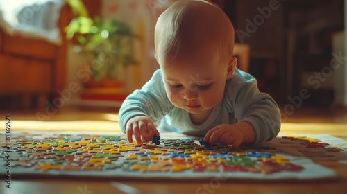 A baby plays with a colorful puzzle on the floor.