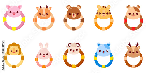 A baby rattle with a ring. A rattle with a cartoon animals for kids. A gift for newborns. set