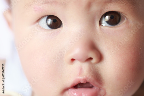 A baby's facial features; a curious expression