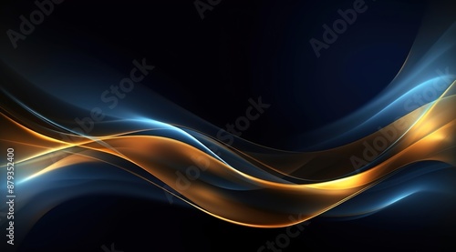 A background featuring an abstract design of dark blue hues intertwined with graceful golden wavy lines and curves.