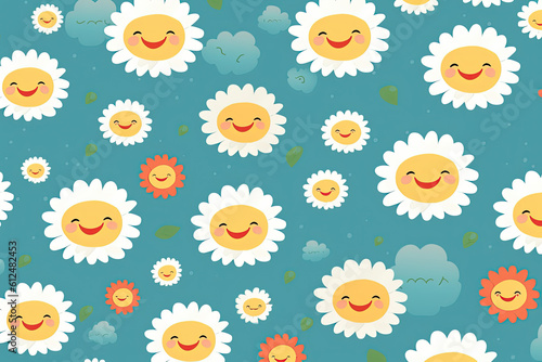 A background of daisies and clouds with happy faces. Cute, playful, happy. Generative AI.