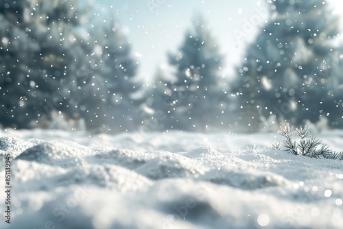 A background of snow, with trees in the distance and snow falling. The foreground is covered in large white soft snow, creating an overall sense of depth.
