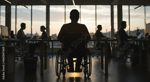 A backlit silhouette of a person in a wheelchair working at a desk in a modern, inclusive office setting.