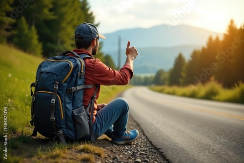 A backpack sits on the side of a rural road, thumb extended upwards, signifying a hiker seeking a ride , outdoors, hiker