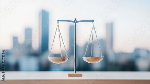 A balanced scale stands as a symbol of justice and fairness against a blurred city backdrop, representing legal concepts and decisions.