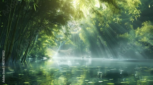 A bamboo forest by the stream and sunlight illustration poster background