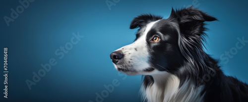 A banner with a Border Collie with black and white fur looking attentive against a blue background.
