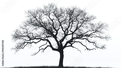 A bare oak tree in winter, its silhouette stark against a white background, highlighting the intricate branches.