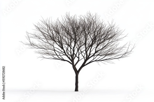 A bare tree with intricate branches stands isolated on white background
