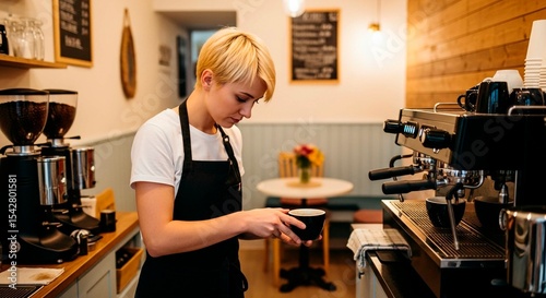 A barista in a black apron holding a coffee cup in a cafe with an espresso machine nearby in focus