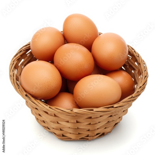 A basket filled with brown eggs sitting on a white surface in a studio environment setting view