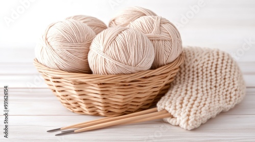 A basket filled with soft yarn and knitting needles rests beside crocheted pieces, creating a serene atmosphere of creativity and comfort