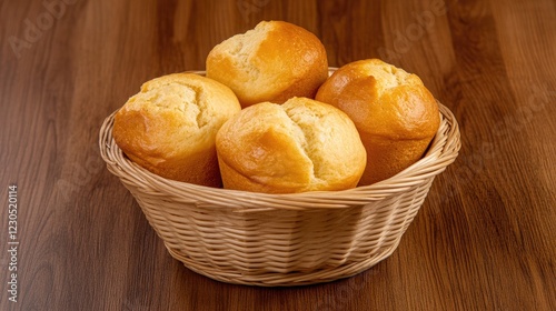 A basket holds freshly baked sweet muffins, showcasing a delicious breakfast treat in soft morning light on a wooden surface