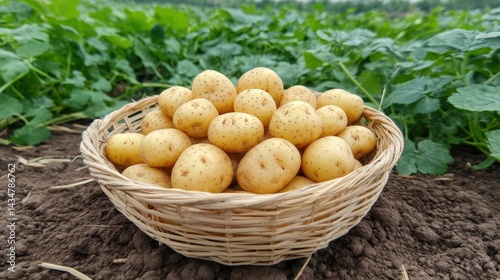 A basket of freshly harvested potatoes sits on rich soil, surrounded by vibrant green foliage, showcasing the bounty of agriculture.