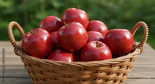 A basket overflowing with shiny red apples sitting on a wooden table in an outdoor setting scene view