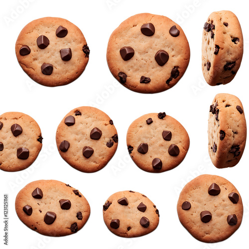 A batch of freshly baked chocolate chip cookies with melted chocolate chips and crisp edges isolated on a clean PNG background, ideal for food photography, recipe books, and bakery-related designs.