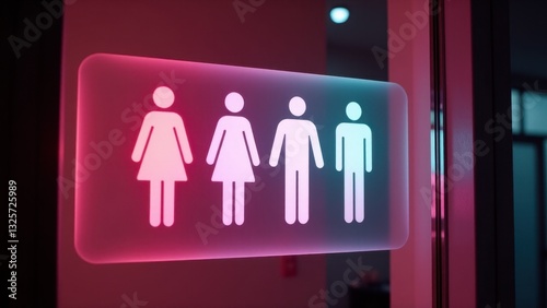 A bathroom sign with symbols for women, men, and gender-neutral individuals, illuminated with pink and blue lighting.