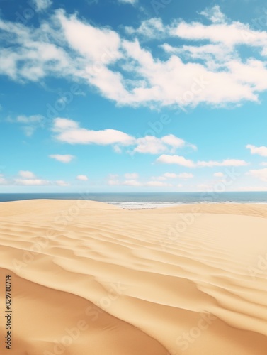 A beach scene with a clear blue sky and a few clouds. The sky is very bright and the clouds are scattered throughout. The beach is empty and the sand is dry