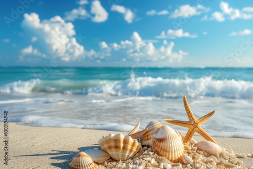 A beach scene with a starfish and shells on the sand