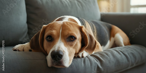 A Beagle dog rests on a gray couch, its expressive eyes conveying a hint of melancholy. Ideal for pet-related websites, blogs, or articles on dog emotions and behavior.