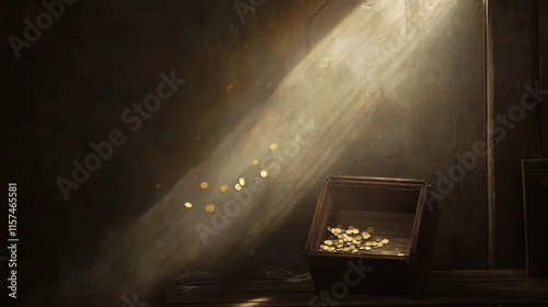 A beam of light illuminates a wooden box filled with gold coins in a dimly lit space.