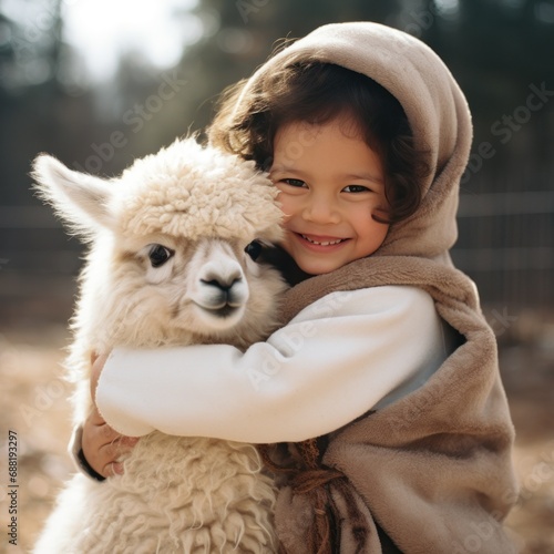 A beaming toddler cradles a fluffy and contented baby alpaca,