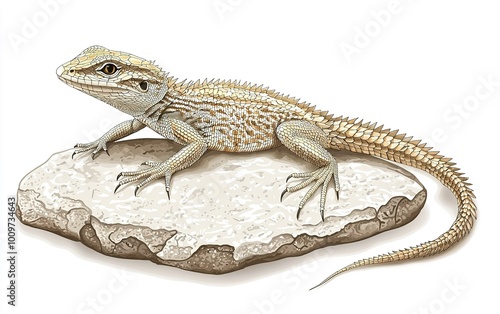 A bearded dragon basking on a flat rock under warm sunlight in a serene desert landscape