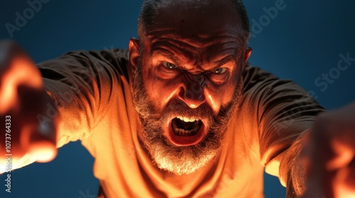 A bearded elderly man is angrily shouting directly at the camera with intensity and aggression, showcasing raw emotion and strength in dramatic lighting.