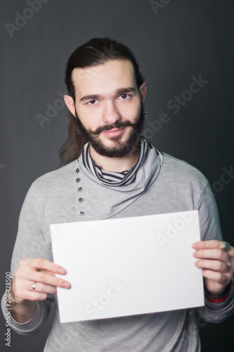 A bearded guy. Hipster model. fashion portrait in studio on a gray background with a piece of white paper in hands