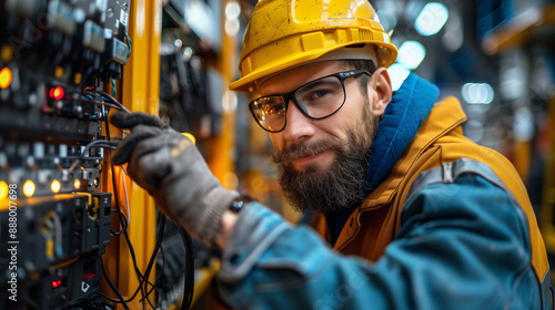 A bearded male engineer wearing a yellow hard hat and safety glasses is working on electrical equipment in an industrial setting. He is focused and appears to be adjusting wires or components.
