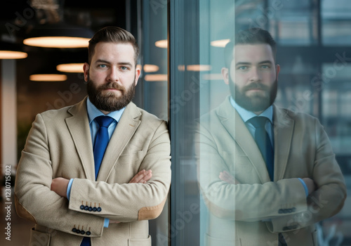 A bearded man in a beige blazer and blue tie, standing with arms crossed next to a large window