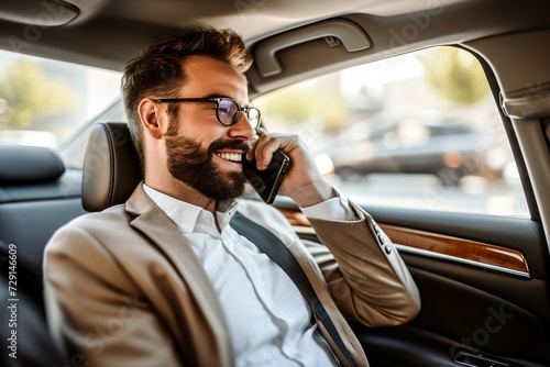 A bearded man in glasses sits in his car, talking on the phone with a look of determination on his face as he drives through the city streets