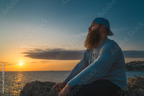 A bearded man is sitting at the rocky shoreline and watching the sea sunset