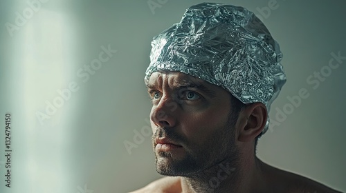 A bearded man wearing a tin foil hat, looking serious and thoughtful, symbolizing conspiracy theories and paranoia.