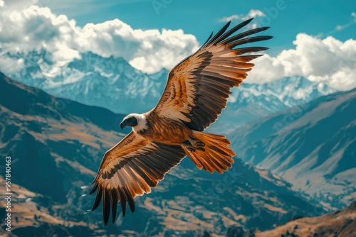 A Bearded Vulture Soaring Over Majestic Mountains