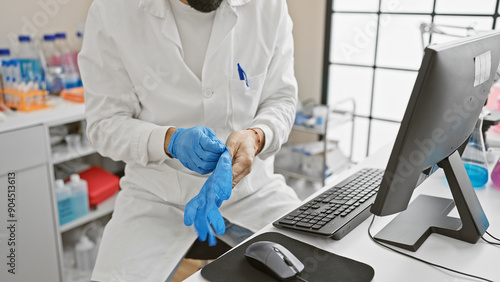 A bearded young man in a white lab coat putting on blue gloves in a bright laboratory setting with a computer.